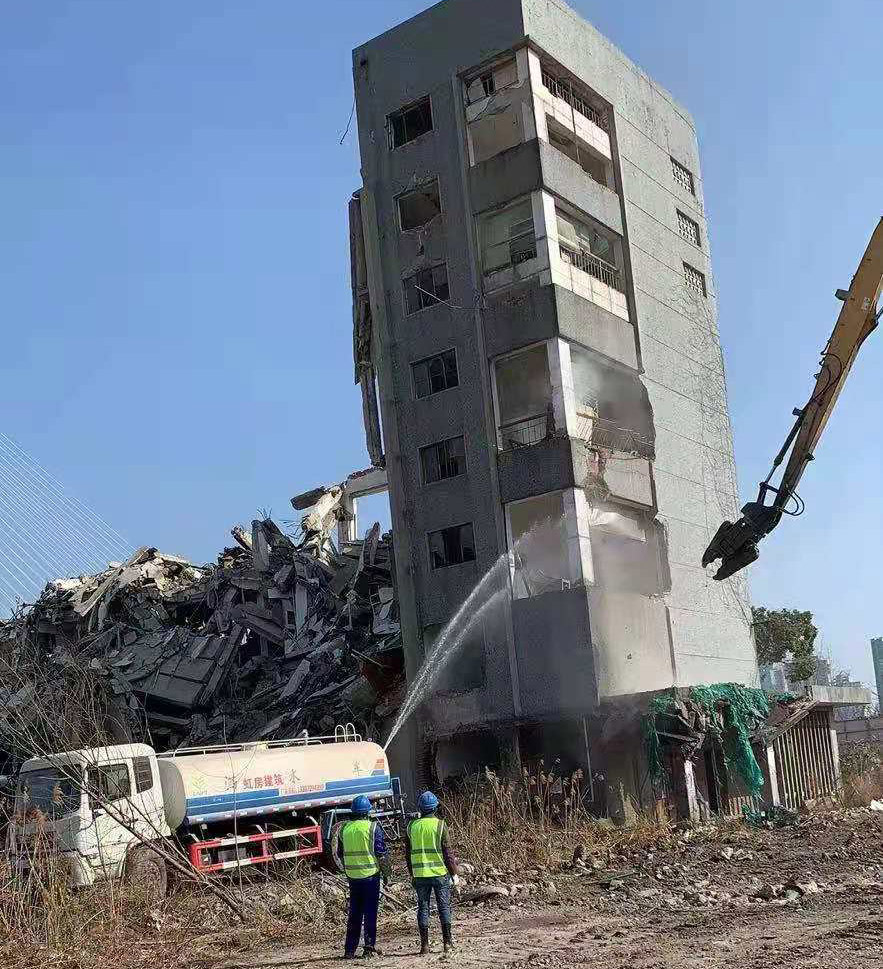 拆除工程房屋结构形式为框架结构,高度约17米,需要长臂剪刀机进行拆除,550型长臂机最高拆除27米,同时调配300型压力钳、220型镐头机进行混凝土破碎,其它民防结构都将采用镐头机、剪力钳来进行拆除,同时组织人员氧气乙炔来将钢筋切割分段拆除打包装车,建筑垃圾及时清运等顺延施工。根据业主的要求,以及工程管理、工期、质量、安全、文明、环保各项目标,结合工期紧,环保力度大,防护要求高的特点,实行“防护先行,先交先拆,逐阶段拆除,障清场平”的施工宗旨,按实按质量完成工程。